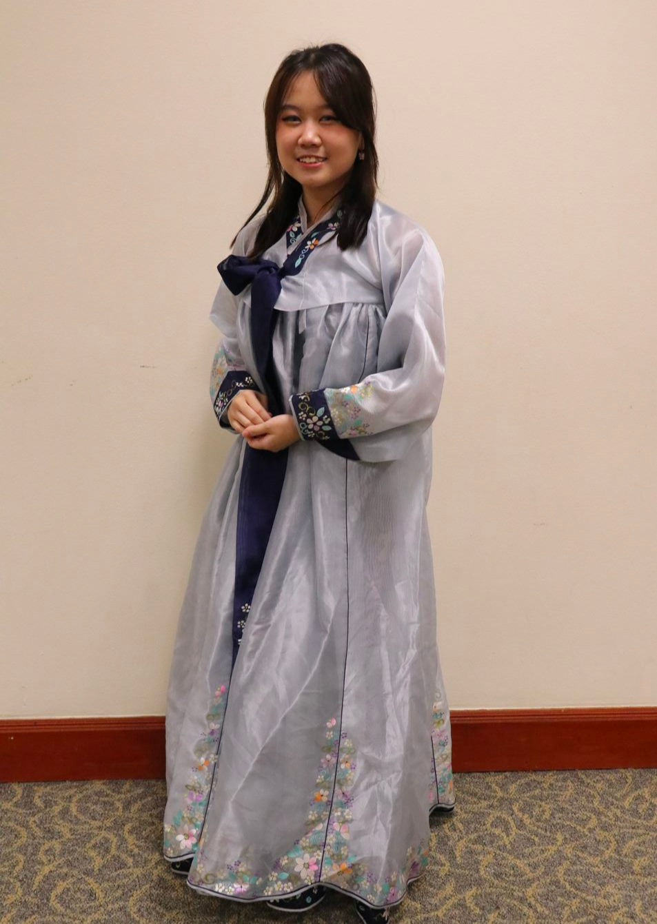 Shanice Teo from Chung Hwa Middle School ( Delegate ), as shown above, wears the traditional women’s Hanbok which hails from Korean Culture. Notice how the beautiful fabric has been embroidered with delicate floral patterns at the bottom and the ‘goreum’ is in a complementary dark, navy hue.
